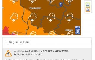 Von Südwesten ziehen Gewitter auf. Dabei gibt es Sturmböen mit Geschwindigkeiten um 85 km/h (24m/s, 47kn, Bft 9) sowie Starkregen mit Niederschlagsmengen bis 25 l/m² pro Stunde und kleinkörnigen Hagel.