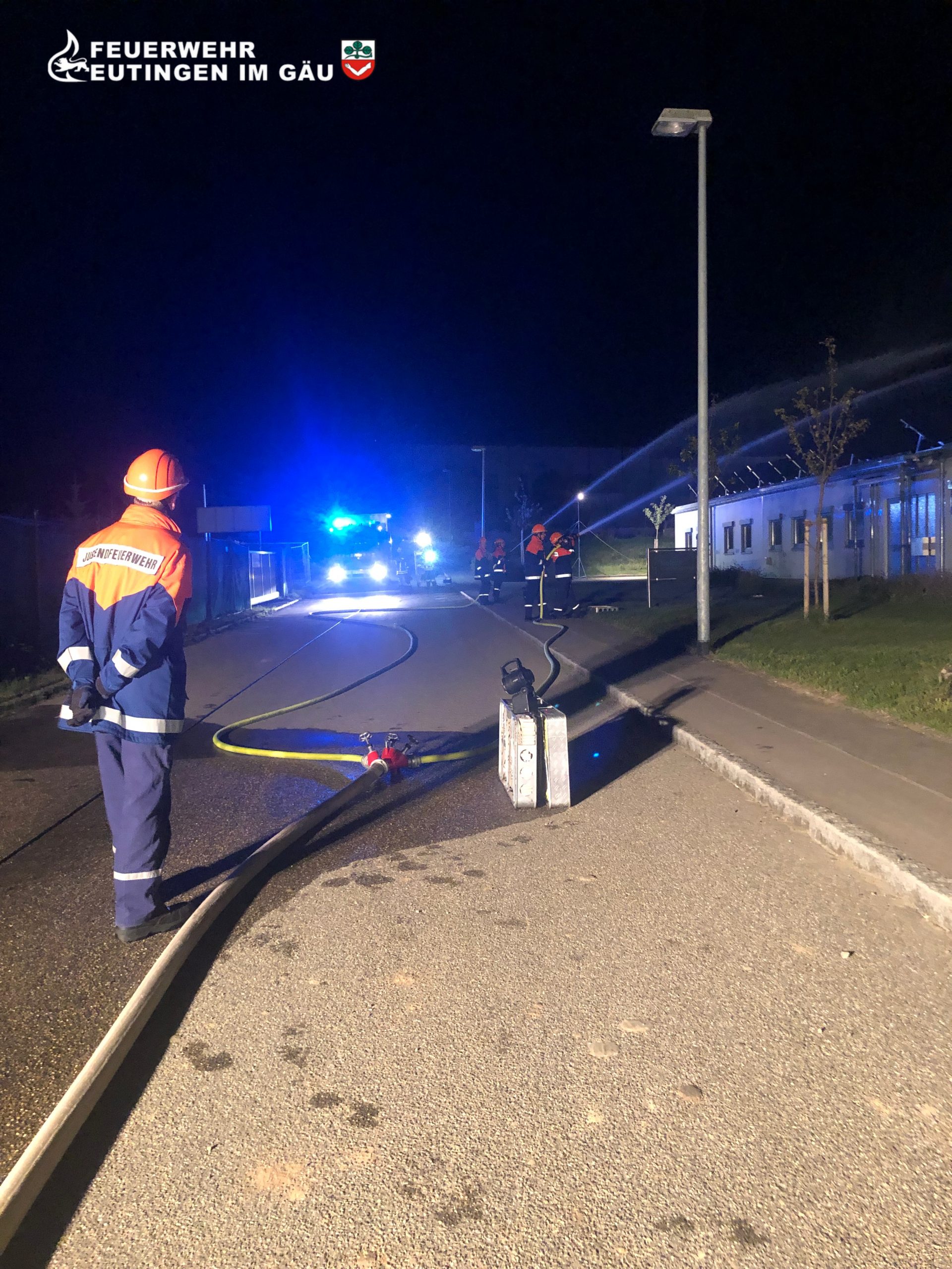 Nach dem ersten Einsatz war natürlich nicht an Schlafengehen zu denken. Es gab viel zu erzählen und schließlich wurde noch gemeinsam ein Film angeschaut. Gerade als dieser beim Abspann angekommen war und die Jugendlichen überlegten, wie es nun weitergehen sollte, kam der nächste Alarmgong mit der Durchsage „Einsatz für die Jugendfeuerwehr“, diesmal „unklare Rauchentwicklung, Firma Kieferle„. Der MTW fuhr zur Erkundung raus und alarmierte beim Eintreffen im Industriegebiet Hummelberg unverzüglich alle anderen Kräfte nach, denn ein Brand in der Produktionshalle wurde angenommen, der auf das angrenzende Bürogebäude überzugreifen drohte. So waren alle nochmal zu einem zweiten Nachteinsatz gefordert. Ausleuchtung der Einsatzstelle wurde aufgebaut, Schläuche verlegt und das „Feuer“ gelöscht. Nach der Rückkehr ins Feuerwehrhaus waren zwar fast alle schon müde, aber bei dem ein oder anderen dauerte es noch ein wenig, bis er zum Schlafen kam.