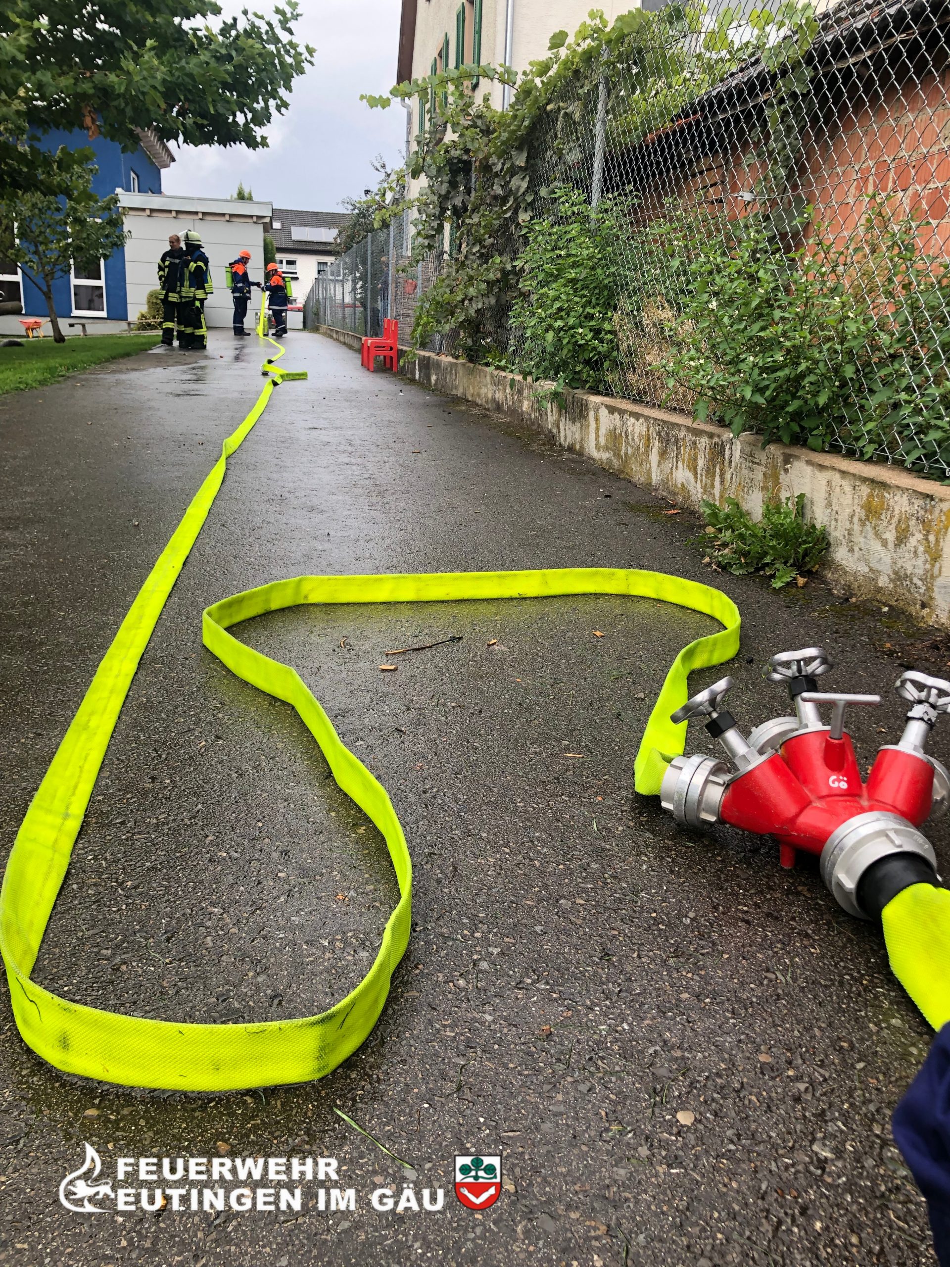 Zum Glück musste sich niemand langweilen, denn der nächste Einsatz kam schon gleich: Rauchentwicklung im Göttelfinger Kindergarten und eine verletzte Person. Bereits auf der Anfahrt von Eutingen nach Göttelfingen war die Rauchwolke zu sehen – zwar nur Disconebel aber trotzdem sehr beeindruckend.