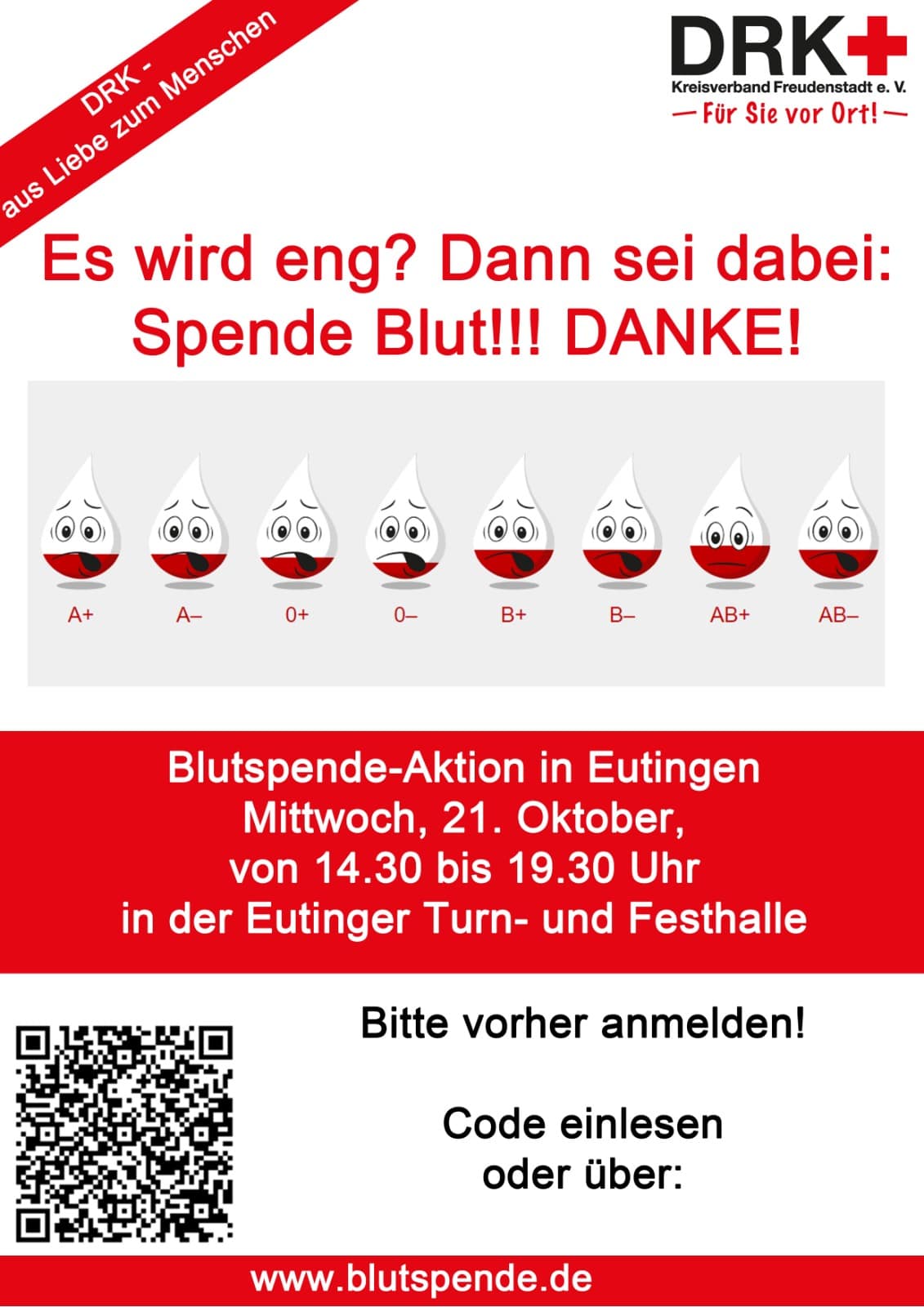 Herzliche Einladung zur Blutspende am 21. Oktober 2020 in der Eutinger Turn- und Festhalle.