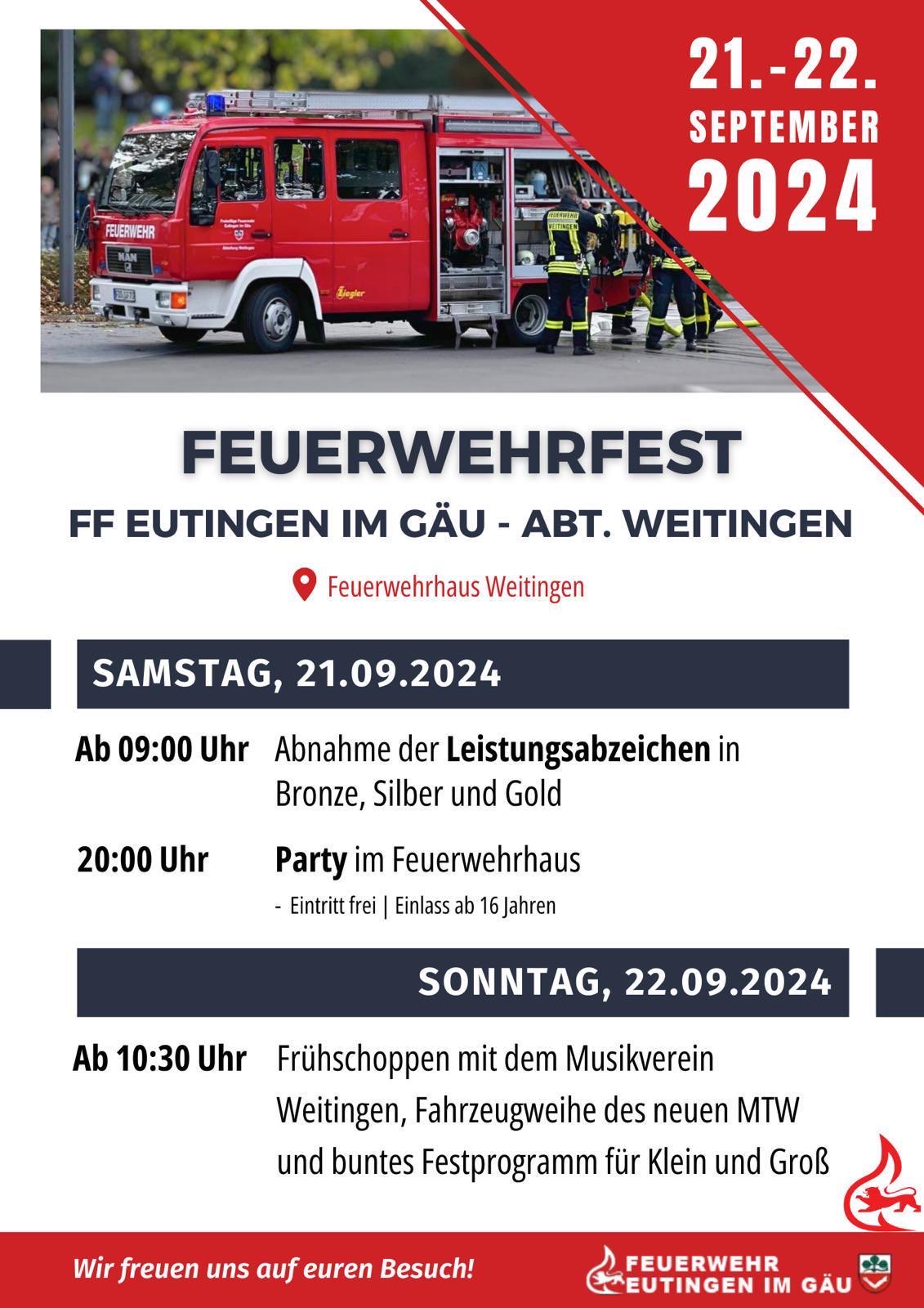 Vom 21. -22. September 2024 feiert unsere Abteilung Weitingen ihr Feuerwehrfest mit Abnahme von Leistungsabzeichen und der Fahrzeugweihe für den neuen Mannschaftstransportwagen. Details können den Flyern entnommen werden. Wir freuen uns auf euer Kommen.