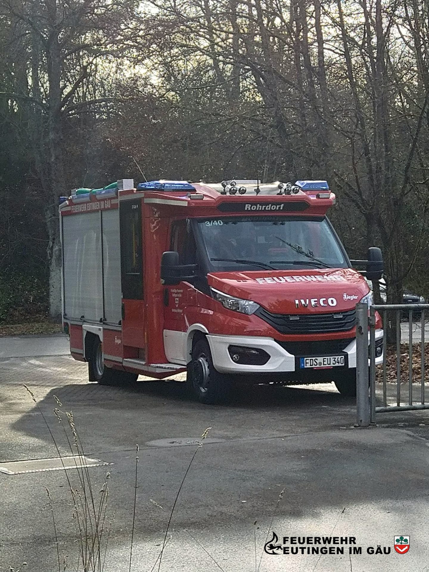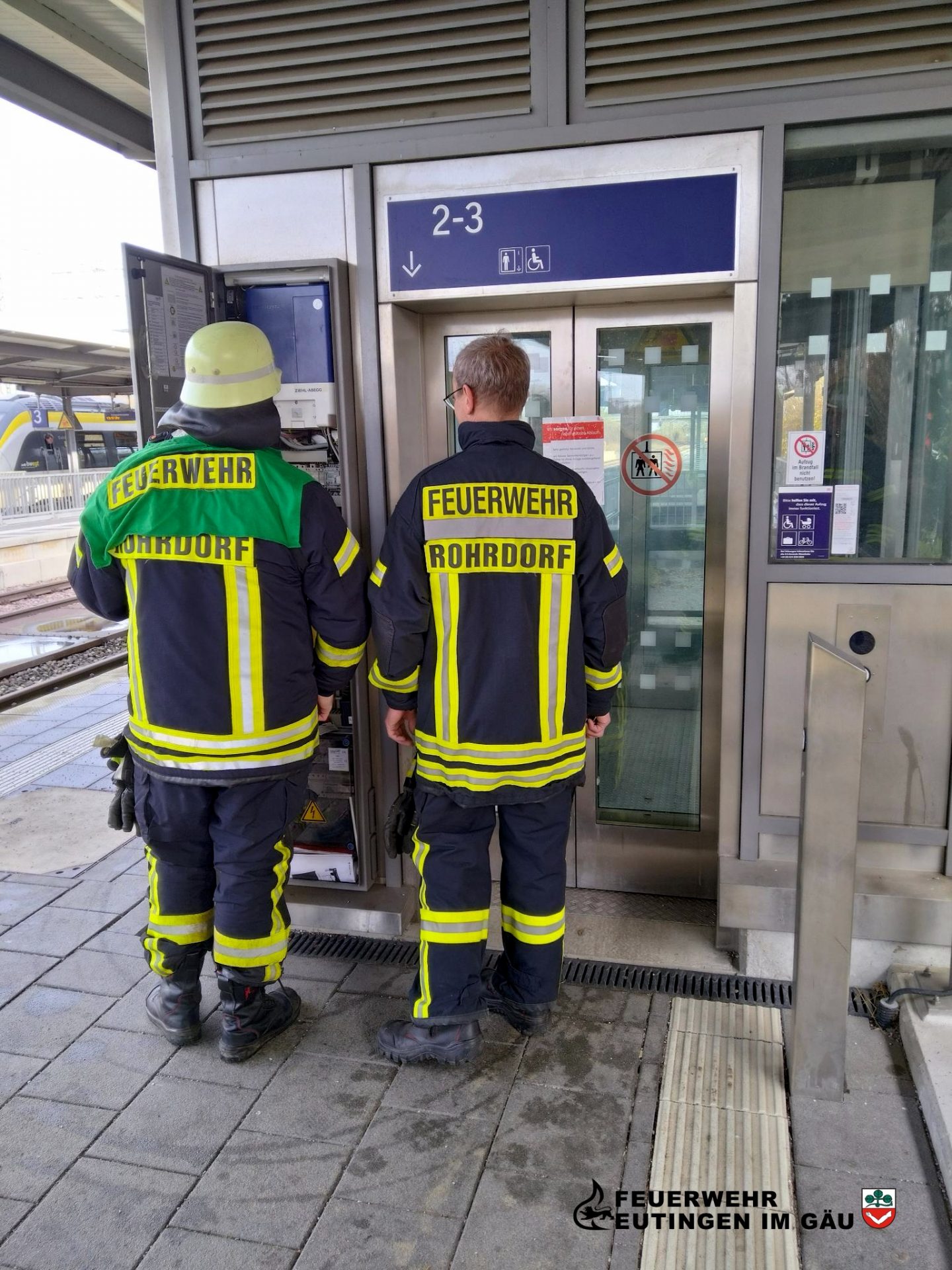 Am 24.11.2024 wurden die Türöffnungsgruppen der Abteilungen Rohrdorf und Eutingen sowie unser Kommandant um 12:59 Uhr an den neuen Bahnhof Eutingen auf Gemarkung Rohrdorf alarmiert. Vor Ort waren Personen in einem der Aufzüge bei den Bahngleisen stecken geblieben. Unsere Einsatzkräfte konnten den Aufzug über die Notaufzugssteuerung manuell hoch fahren und die Tür öffnen. Alle eingeschlossenen Personen konnten unbeschadet den Aufzug verlassen. Die ebenfalls hinzugezogene Streife der Polizei Horb wurde durch den Kommandanten über den Einsatz informiert. Im Anschluss wurde die Einsatzstelle an die Polizei übergeben. Das neue Einsatzfahrzeug der Abteilung Rohrdorf hat somit seine „Feuertaufe“ erfolgreich gemeistert.