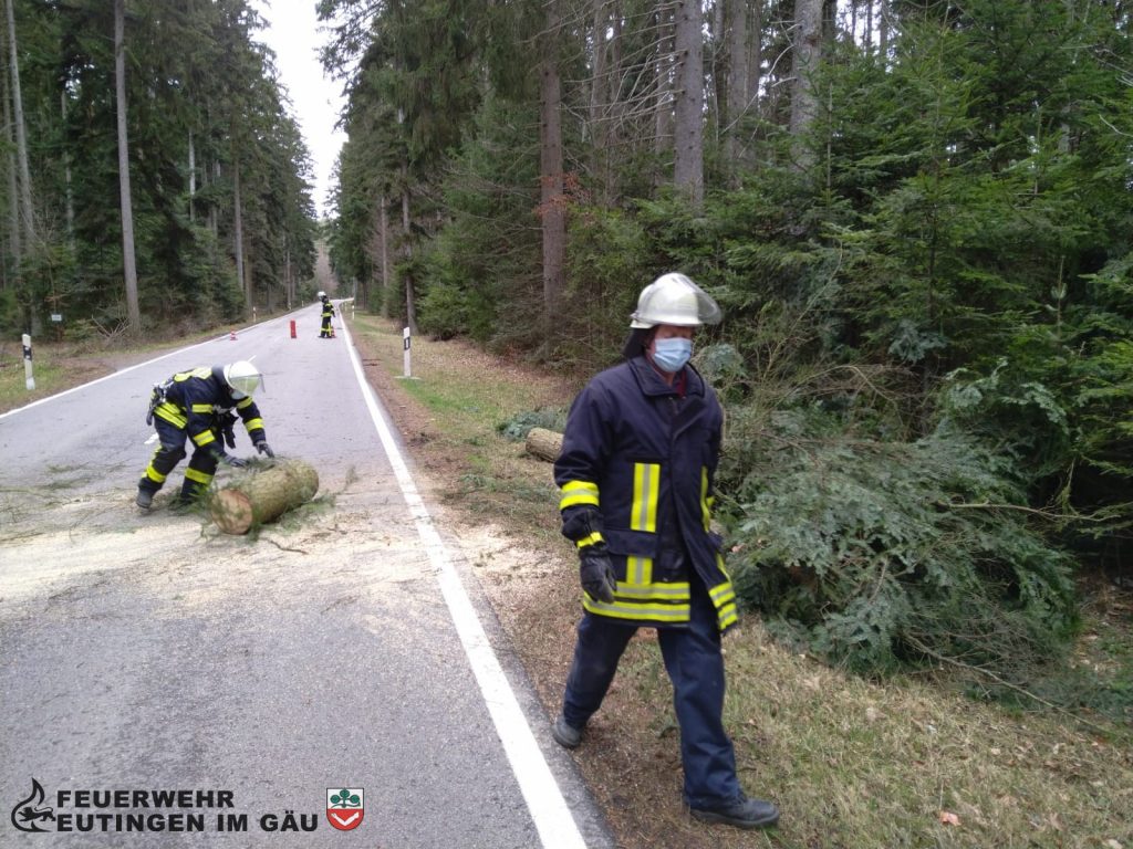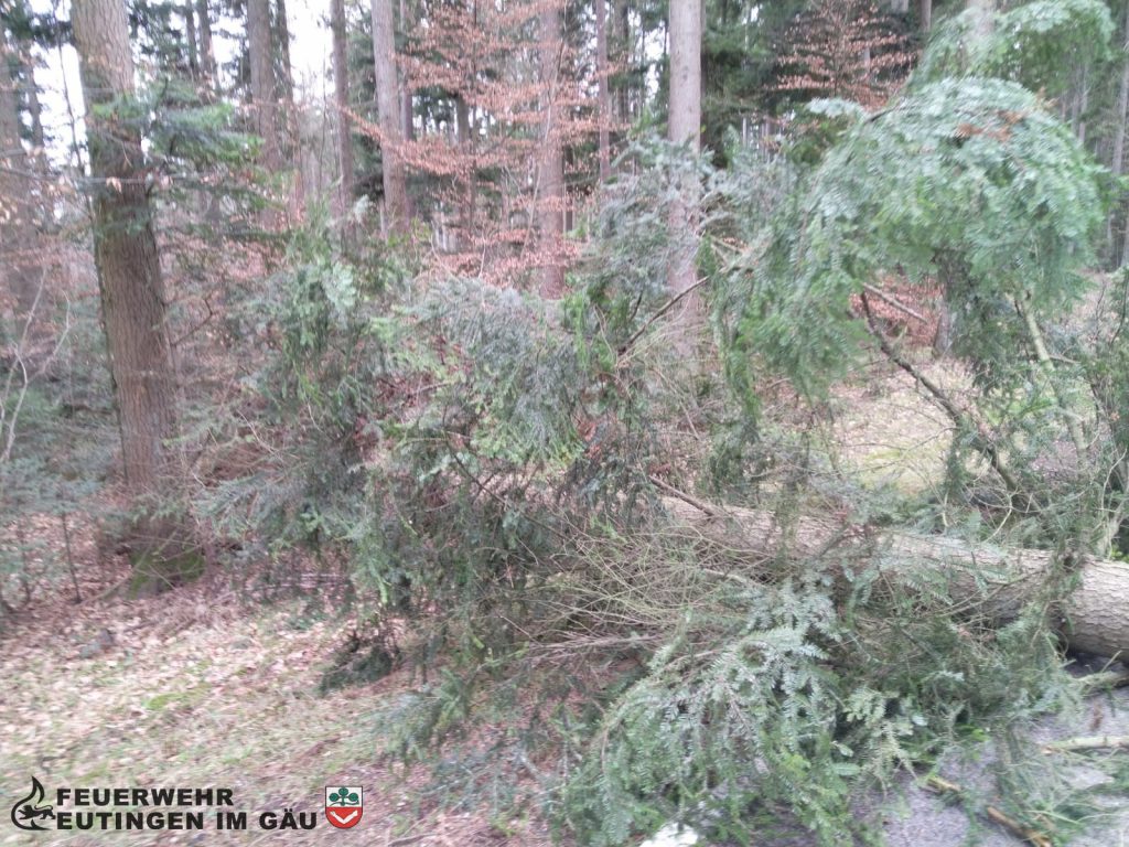 Um 11:58 Uhr wurde unsere Abteilung Eutingen zu einem umgestürzten Baum auf der K4716 Eutingen Richtung Untertalheim alarmiert. Vor Ort war eine mächtige Tanne aufgrund des Sturmes auf die Fahrbahn gefallen. Der Baum wurde zerkleinert und am Straßenrand abgelegt sowie die Straße gereinigt.