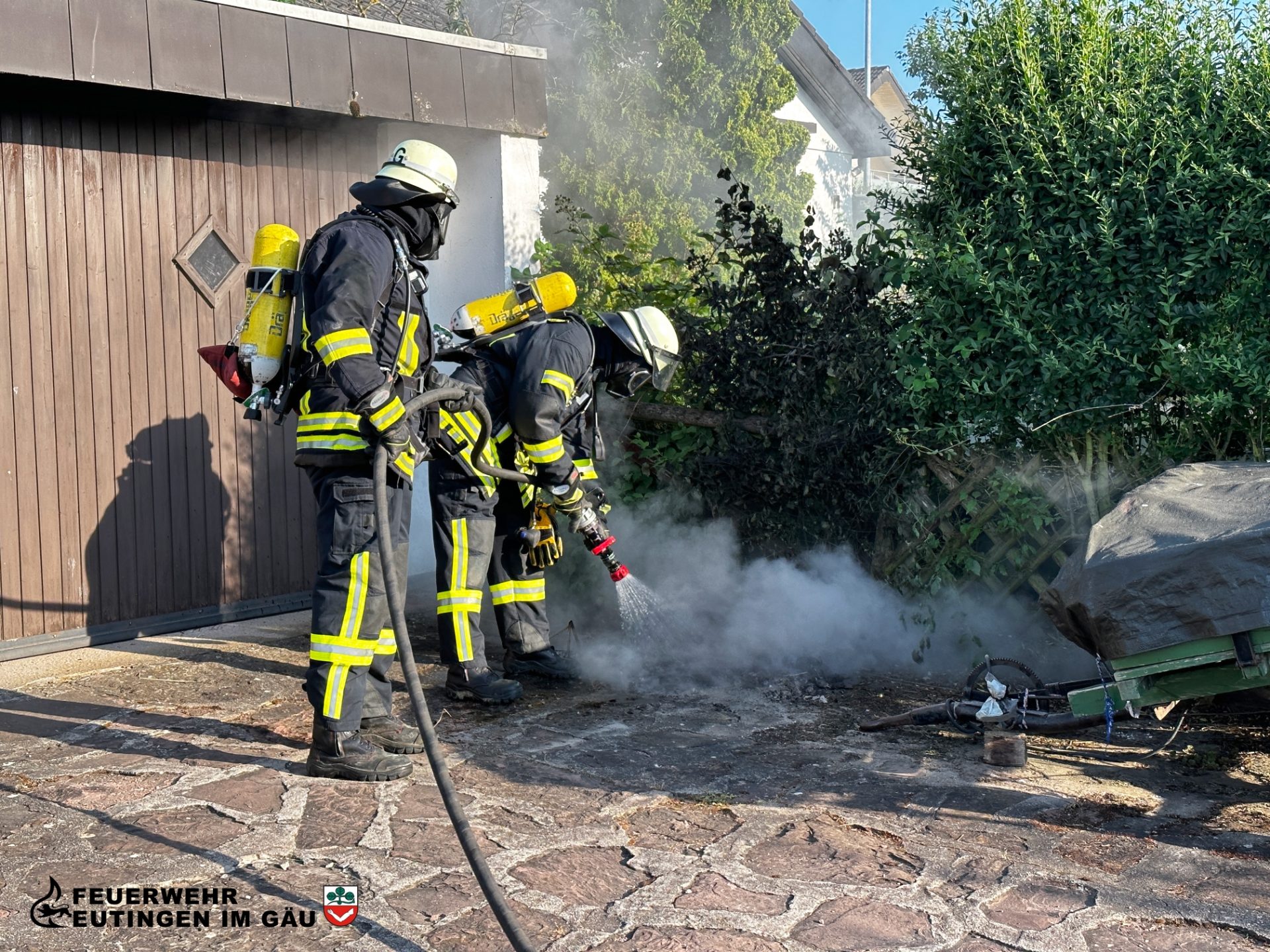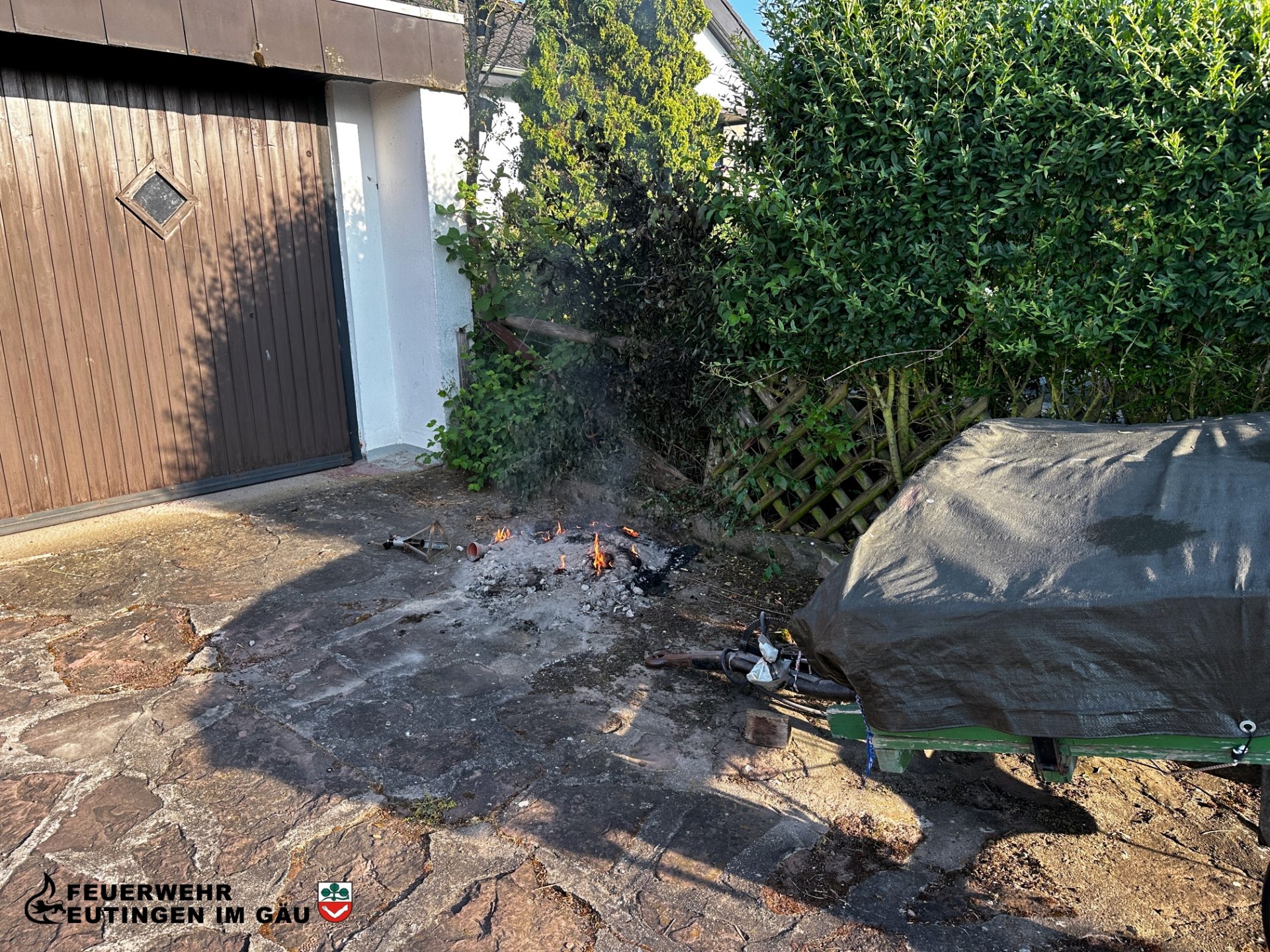 Der Zeitungausträger hatte den Brand im Hof bemerkt und zusammen mit Nachbarn einen direkt betroffenen PKW-Anhänger von der Brandstelle weggezogen. Allein diesem umsichtigen handeln haben wir es zu verdanken, dass nichts Schlimmeres passiert ist.