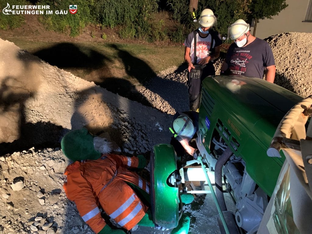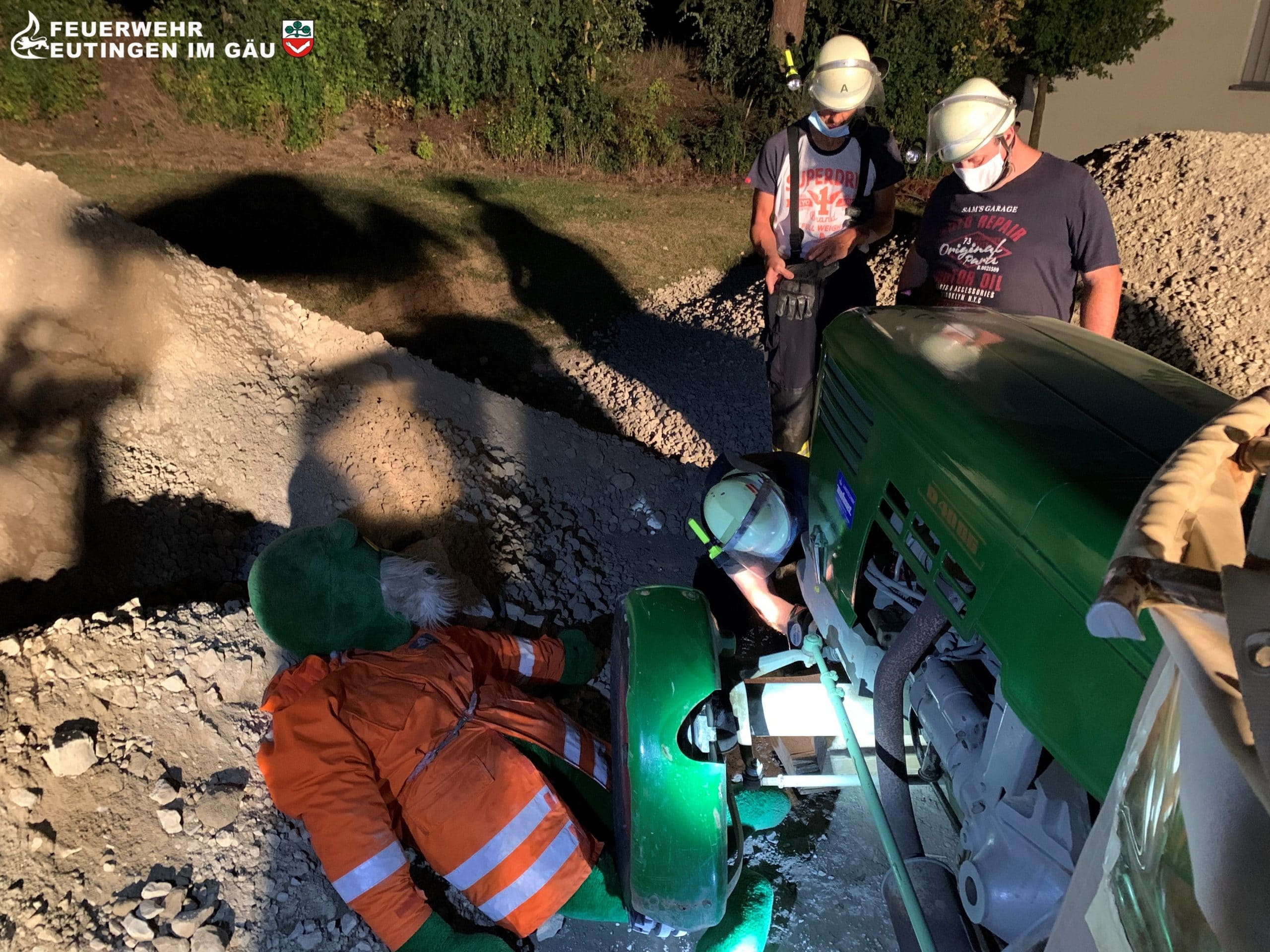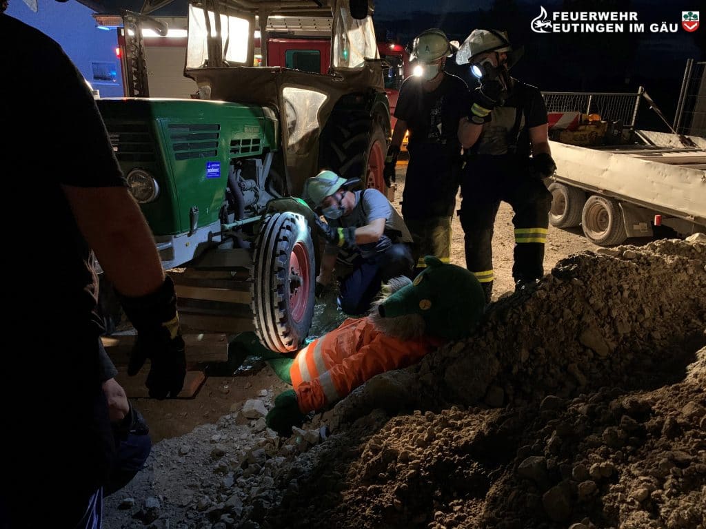 Die Befreiung unsere Rettungspuppe „Olaf“ welche unter einem Traktorreifen eingeklemmt war. Da die Abteilung Göttelfingen über kein hydraulisches Rettungsgerät verfügt musste mit Hebelkraft, Köpfchen und der Standardbeladung des LF 8/6 gearbeitet werden.